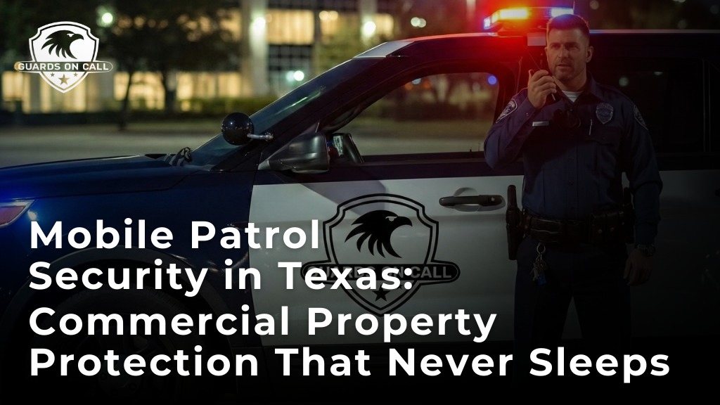 Guards On Call provides 24/7 mobile patrols across Texas to protect large sites, parking lots, and multiple properties. Our marked vehicles, GPS-tracked routes, and detailed reports ensure complete transparency and rapid response.